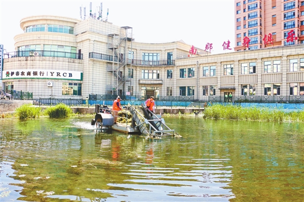 近日,伊美区水上公园建设服务中心对水上公园河道和黎明湖进行清理整治,利用机械对水面上漂浮的垃圾、杂草进行打捞清除,使水面更加清澈、环境更优美。这是工作人员在清草船上清理湖面杂草。